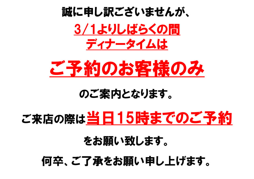 また、誠に申し訳ございませんが、3/1よりしばらくの間、ディナータイムはご予約のお客様のみのご案内となります。
